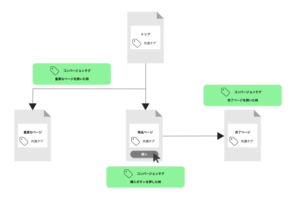 共通タグを全ページに配置したら、今度はコンバージョンを計測したいタイミングで、共通タグと同じようなコンバージョン用のプログラムである「コンバージョンタグ」を実行する必要があります。